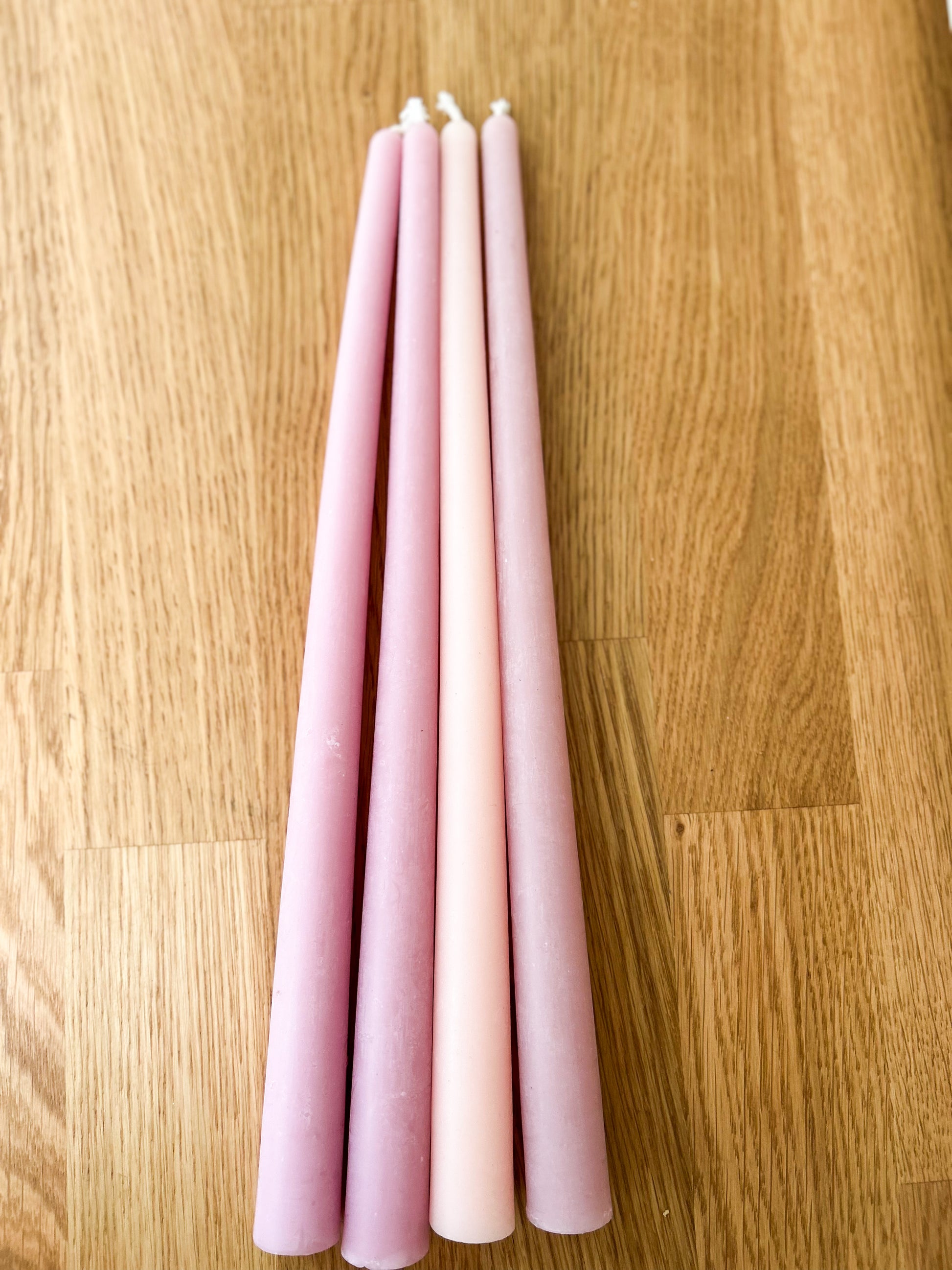 Each taper candle is 12”. 100% beeswax with toxin-free dye and 100% cotton wick. Burn time is approximately 12 hours.