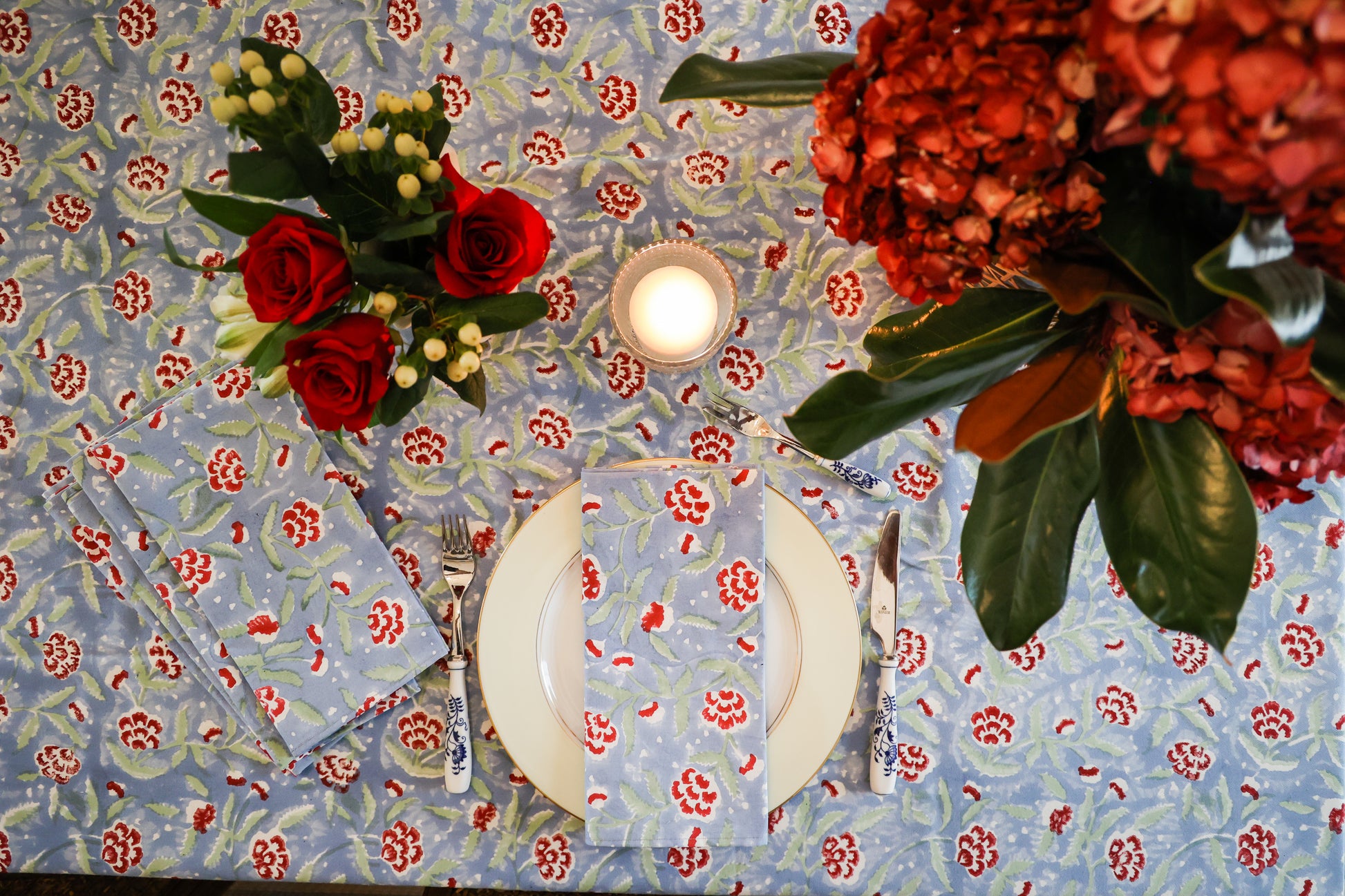 PRODUCT DESCRIPTION: These napkins come in a set of 4, 20” square. They are hand block printed on percale, which is a wrinkle-resistant, very soft but durable fabric.