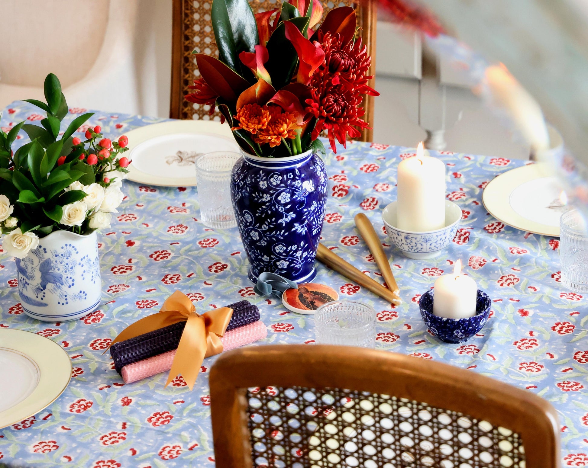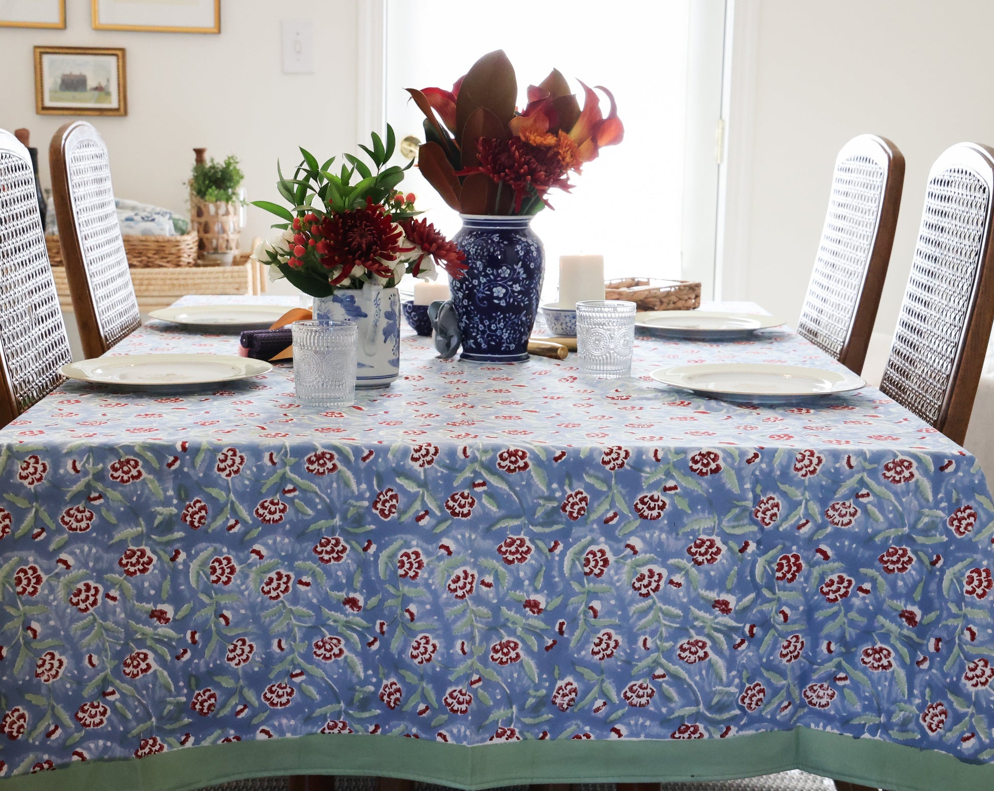 PRODUCT DESCRIPTION: This tablecloth is hand block printed on 100% cotton canvas, which is a heavy and very durable, stain resistant fabric. Given the nature of the hand block print process, expect variations throughout. We believe this adds to the charm of the design.